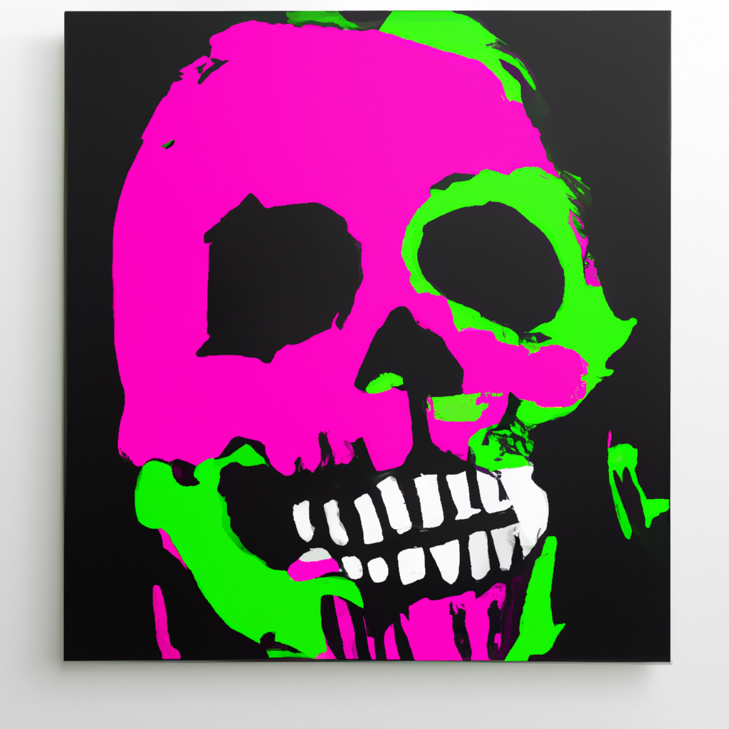 Description: Skull Study No. 6 is a bold and vibrant interpretation of the human skull, captured through serigraphy. The piece juxtaposes a neon palette of hot pink, electric green, and sharp white against a stark black background, creating a striking contrast that is both visually captivating and emotionally provocative. The vibrant colors challenge traditional representations of mortality, offering a modern and almost playful approach to a classical memento mori symbol.